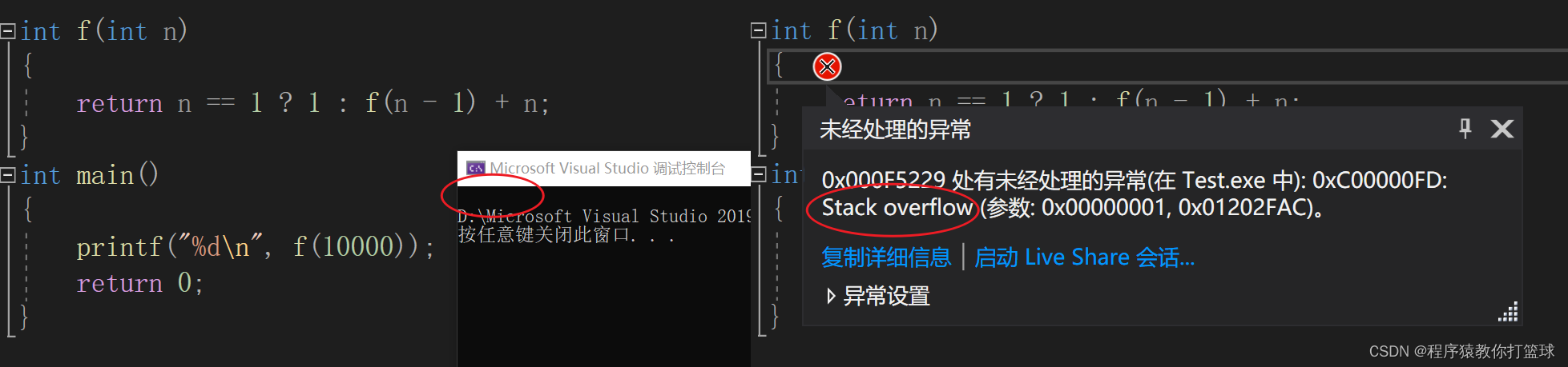 我们可以看到,当数值达到10000的时候程序已经崩了,并不会显示任何错误,当我们进入调试可以发现报错显示栈溢出,那为什么会造成栈溢出呢,我们接着往下看!