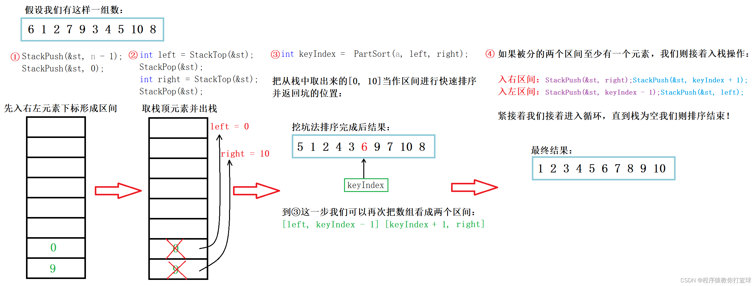 //挖坑法 - 升序 int PartSort(int* a, int left, int right) { int begin = left; int end = right; int key = a[begin]; int pivot = begin; while (begin < end) { while (begin < end && a[end] >= key) { --end; } a[pivot] = a[end]; pivot = end; while (begin < end && a[begin] <= key) { ++begin; } a[pivot] = a[begin]; pivot = begin; } pivot = begin;//当begin与end相遇,随便把begin和end的值给pivot a[pivot] = key; return pivot; } void QuickSortNonR(int* a, int n) { Stack st; StackInit(&st);//初始化栈 StackPush(&st, n - 1);//入数组最后一个元素下标 StackPush(&st, 0);//入数组第一个元素下标 while (!StackEmpty(&st))//当栈不为空我们就进入循环 { int left = StackTop(&st);//取出栈顶元素给left StackPop(&st);//出栈 - 删除栈顶元素 int right = StackTop(&st); StackPop(&st); int keyIndex = PartSort(a, left, right);//使用挖坑法区间排序 //[left, keyIndex - 1] keyIndex [keyIndex + 1, right] - 分成子区间 if (keyIndex + 1 < right)//因栈后进先出的特性,所以先入右区间 { StackPush(&st, right); StackPush(&st, keyIndex + 1); } if (left < keyIndex - 1) { StackPush(&st, keyIndex - 1); StackPush(&st, left); } } StackDestory(&st);//销毁栈 }