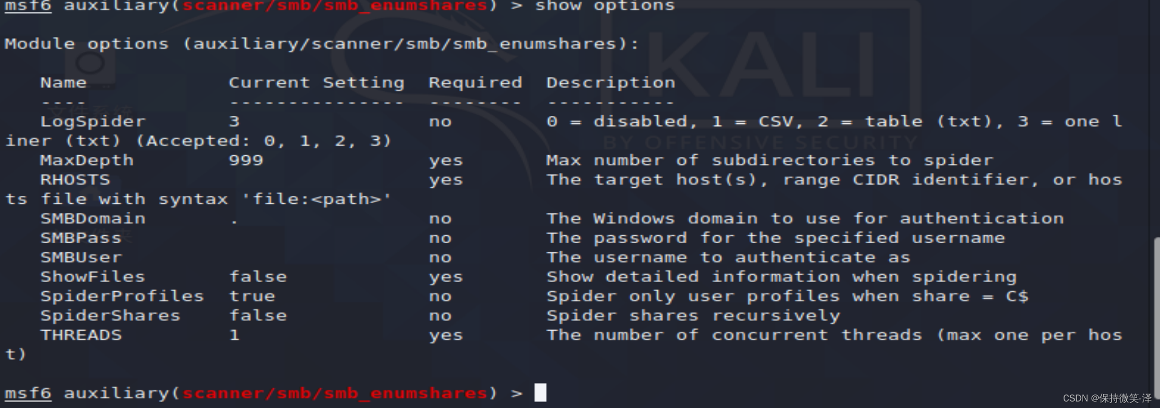 SMB的模块中基本上都是可以配置用户名和密码的,配置了用户名和密码某些模块扫描的结果会更满足我们的需求。也就是说,我们需要知道对方的账号和密码。破解账号密码我们会在后面的-信息收集(ssh暴力破解和fyp暴力破解)里面讲到。