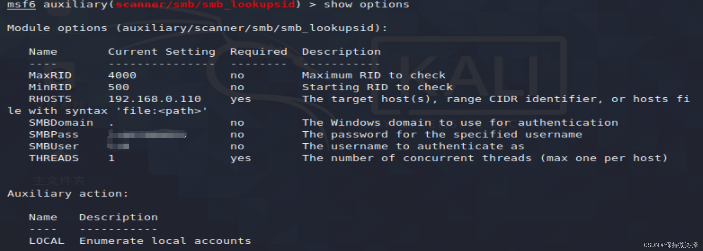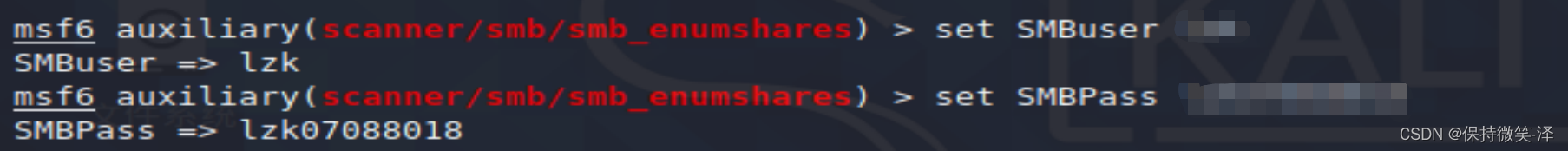 6. 设置目标主机账号和密码 set SMBUser lzk set SMBPass xxxxxx