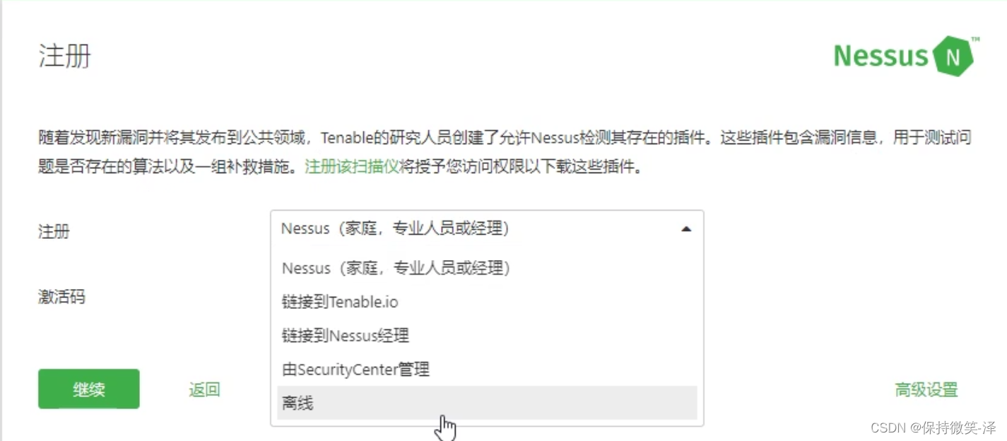 然后通过浏览器打开这个链接 https://192.168.0.109:8834 ,进行注册。注意:选择离线注册。