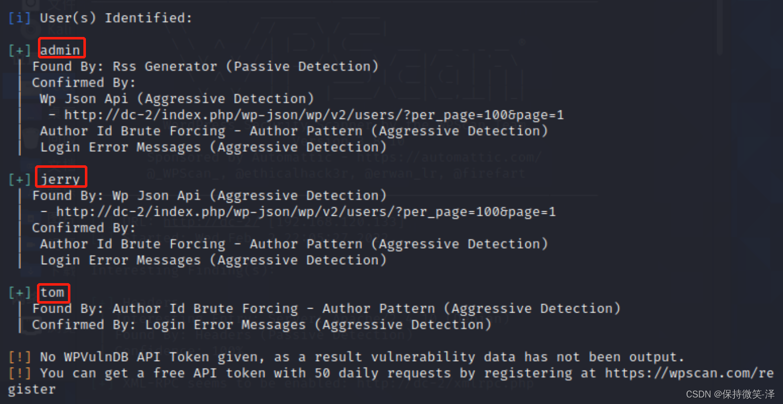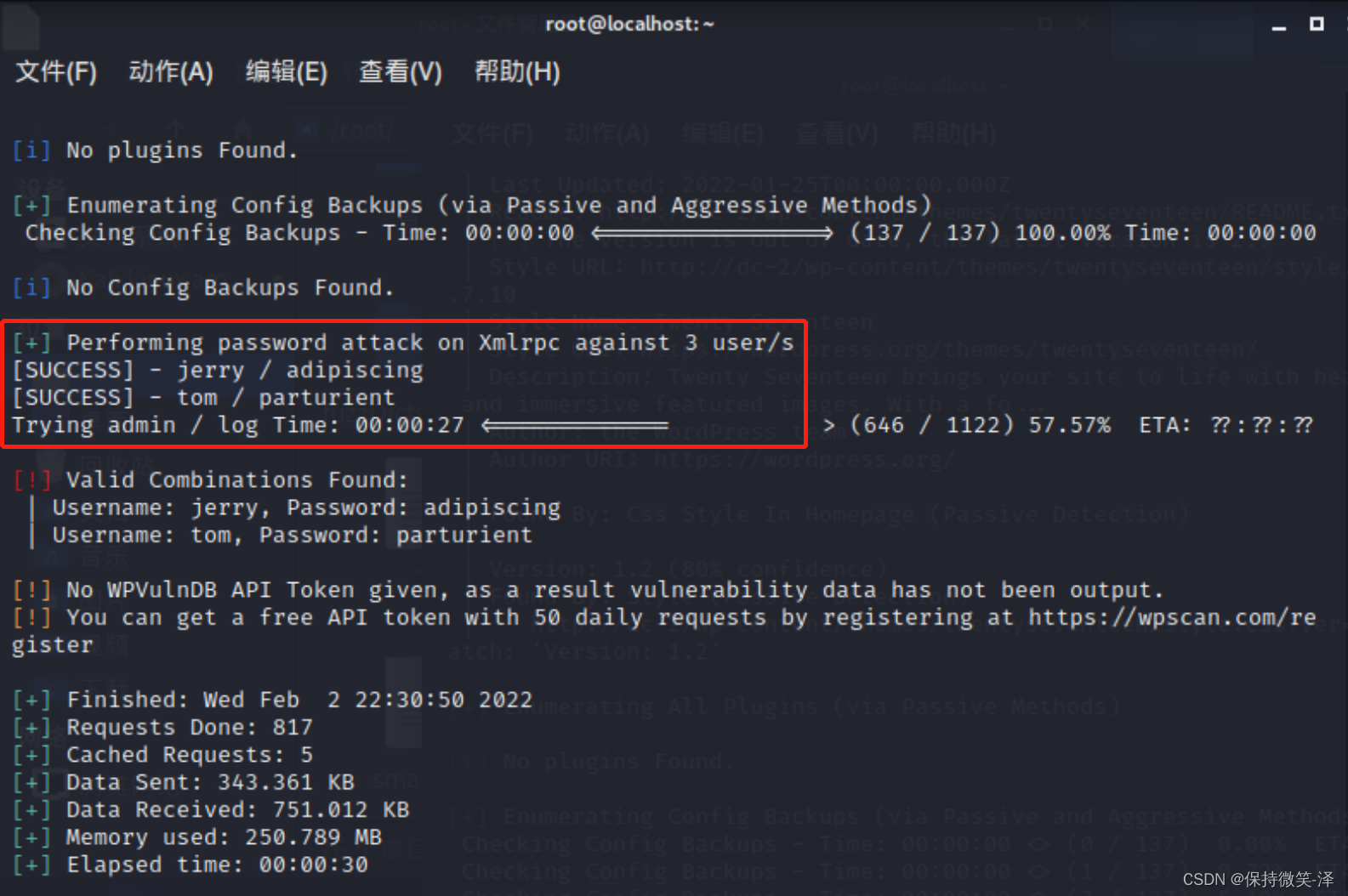 其中2是账号,1是密码。账号就是我们刚刚扫到的三个admin,jerry,tom。密码是根据网站而生成的,使用的是cewl工具。具体的使用操作,可以参考下面的链接。2022-渗透测试-Kali Linux字典生成工具Cewl使用指南_保持微笑的博客-CSDN博客https://blog.csdn.net/qq_38612882/article/details/122755919
