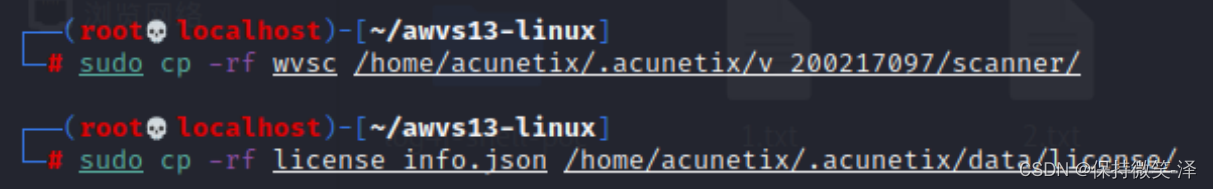 sudo cp -rf wvsc /home/acunetix/.acunetix/v_200217097/scanner/ sudo cp -rf license_info.json /home/acunetix/.acunetix/data/license/