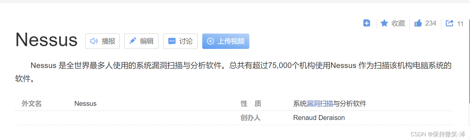 如图,我们可以从百度百科得知:Nessus 是全世界最多人使用的系统漏洞扫描与分析软件。总共有超过75,000个机构使用Nessus 作为扫描该机构电脑系统的软件。