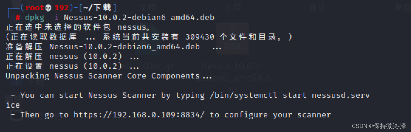 然后打开终端模拟器,输入dpkg -i Nessus-10.0.2-debian6_amd64.deb 然后回车,安装完成。