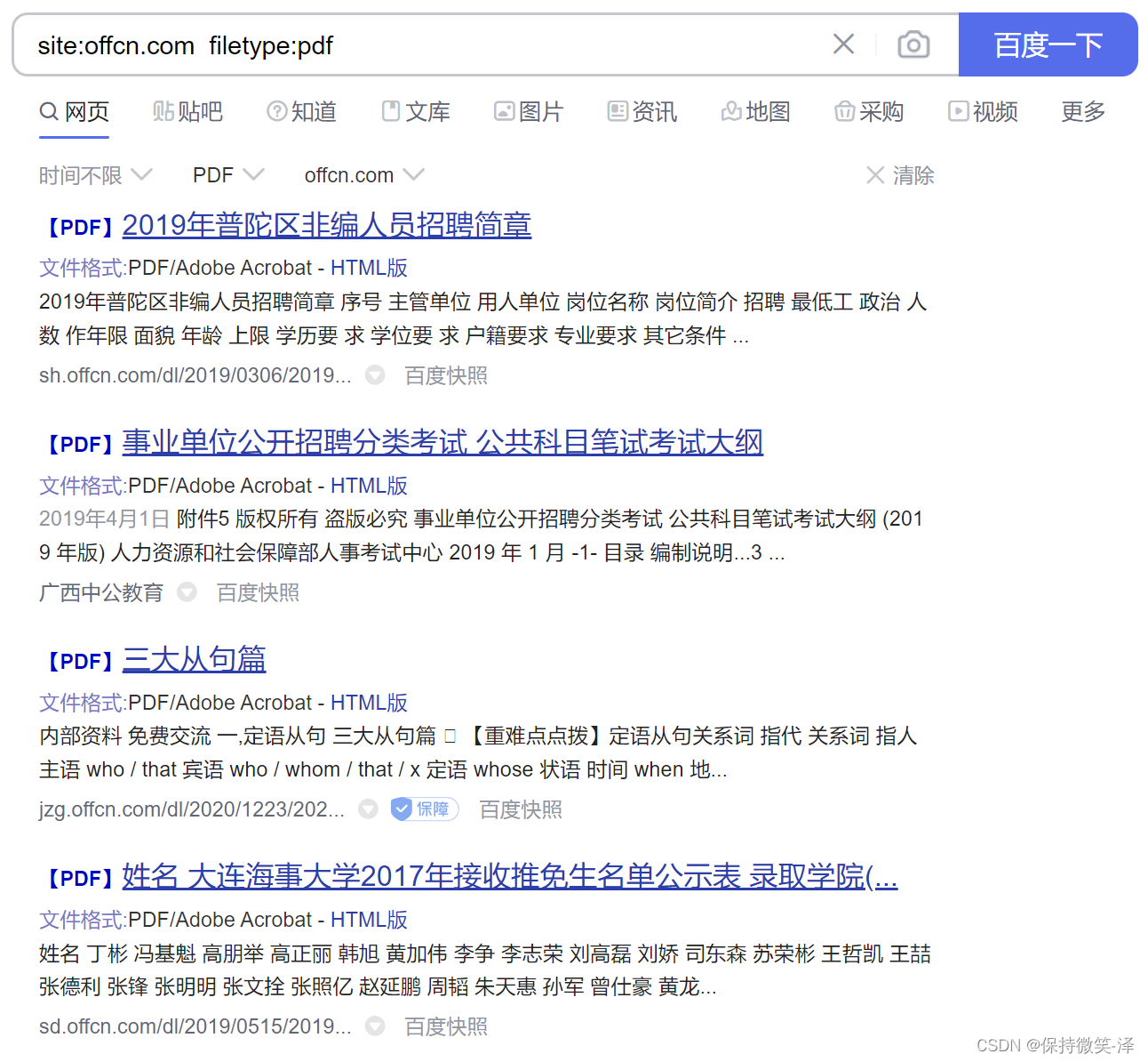 4.搜索网址中包含 pdf 文档的网站: site:offcn.com filetype:pdf