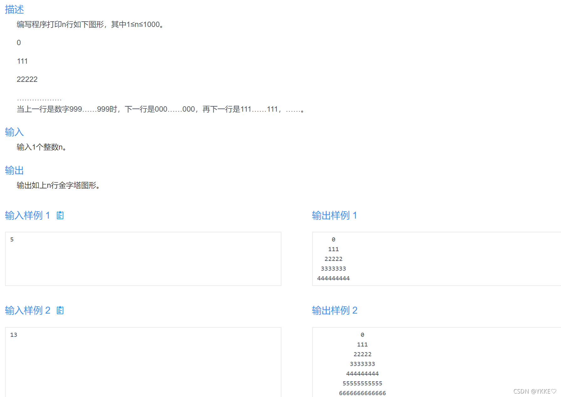 #include<stdio.h int main() { int n, k; int i; scanf("%d", &n); //i是代表行数 for (i = 1; i <= n; i++) { //k代表空格数,因为刚开始的数在居中位置,所以输出的空格应该是输入的数n-行数i for (k = 1; k <=n-i; k++) { printf(" "); } //j代表输出相同数的个数,很显然j是以2i-1往下递增的,并且每打一行,j++,直到j大于2*i-1,跳出循环 for (int j=0;j<2*i-1;j++) { //最后输出的结果为(i-1)%10是因为最大的数是9,当输入的n大于9时,取n对10的余数 printf("%d", (i-1)%10); } printf("\n"); } return 0; }