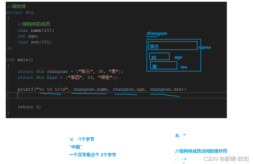 //打印结构体信息 struct Stu s = {"张三", 20, "男", "20180101"}; //.为结构成员访问操作符 printf("name = %s age = %d sex = %s id = %s\n", s.name, s.age, s.sex, s.id); //->操作符 struct Stu *ps = &s; printf("name = %s age = %d sex = %s id = %s\n", ps->name, ps->age, ps->sex, ps- >id); 比