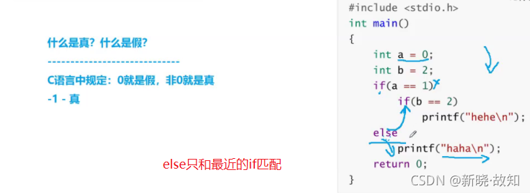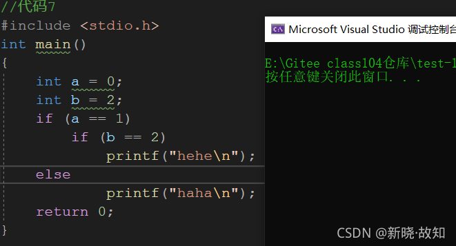//适当的使用{}可以使代码的逻辑更加清楚。 //代码风格很重要 #include <stdio.h> int main() { int a = 0; int b = 2; if(a == 1) { if(b == 2) { printf("hehe\n"); } } else { printf("haha\n"); } return 0; }