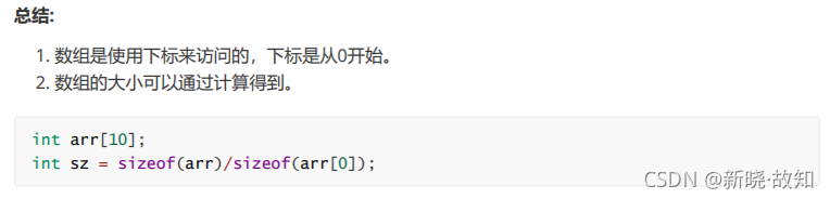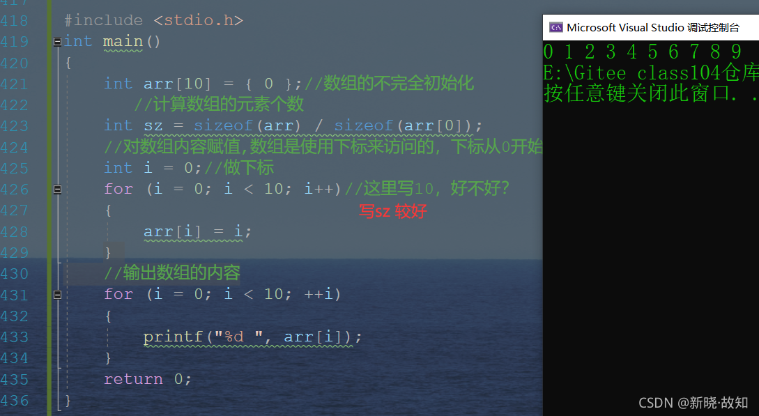 #include <stdio.h> int main() { int arr[10] = { 0 };//数组的不完全初始化 //计算数组的元素个数 int sz = sizeof(arr) / sizeof(arr[0]); //对数组内容赋值,数组是使用下标来访问的,下标从0开始。所以: int i = 0;//做下标 for (i = 0; i < 10; i++)//这里写10,好不好? i<sz { arr[i] = i; } //输出数组的内容 for (i = 0; i < 10; ++i) { printf("%d ", arr[i]); } return 0; }