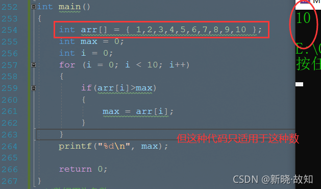 //求10个整数中的最大值 int main() { int arr[] = { 1,2,3,4,5,6,7,8,9,10 }; int max = 0; int i = 0; for (i = 0; i < 10; i++) { if(arr[i]>max) { max = arr[i]; } } printf("%d\n", max); return 0; }