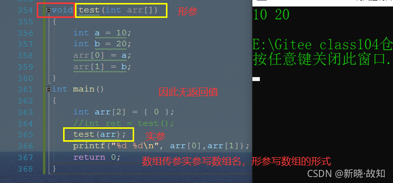 void test(int arr[]) { int a = 10; int b = 20; arr[0] = a; arr[1] = b; } int main() { int arr[2] = { 0 }; //int ret = test(); test(arr); printf("%d %d\n", arr[0],arr[1]); return 0; }