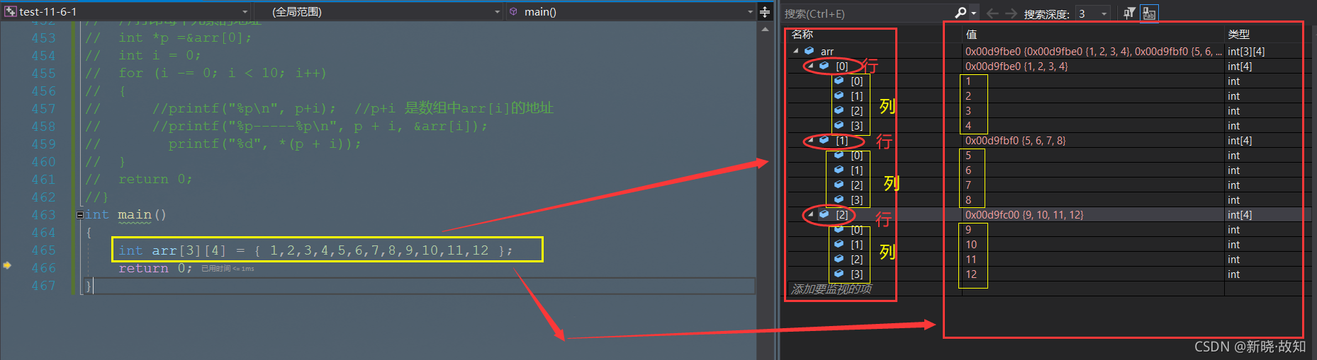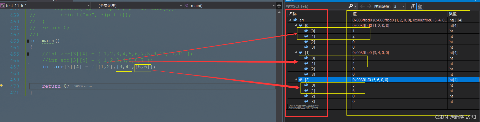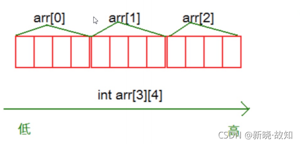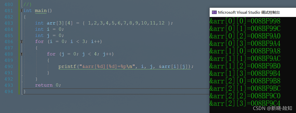 int main() { int arr[3][4] = { 1,2,3,4,5,6,7,8,9,10,11,12 }; int i = 0; int j = 0; for (i = 0; i < 3; i++) { for (j = 0; j < 4; j++) { printf("&arr[%d][%d]=%p\n", i, j, &arr[i][j]); } } return 0; }