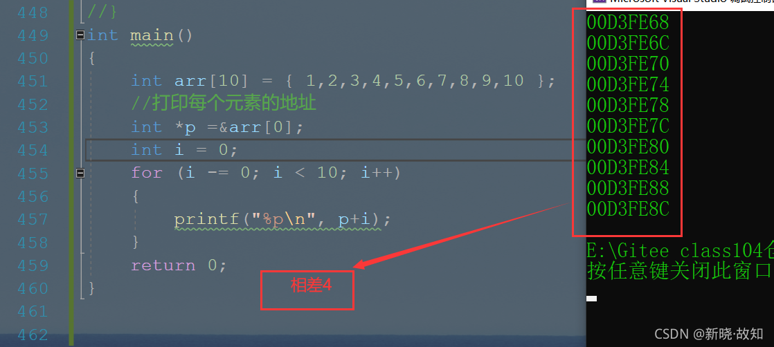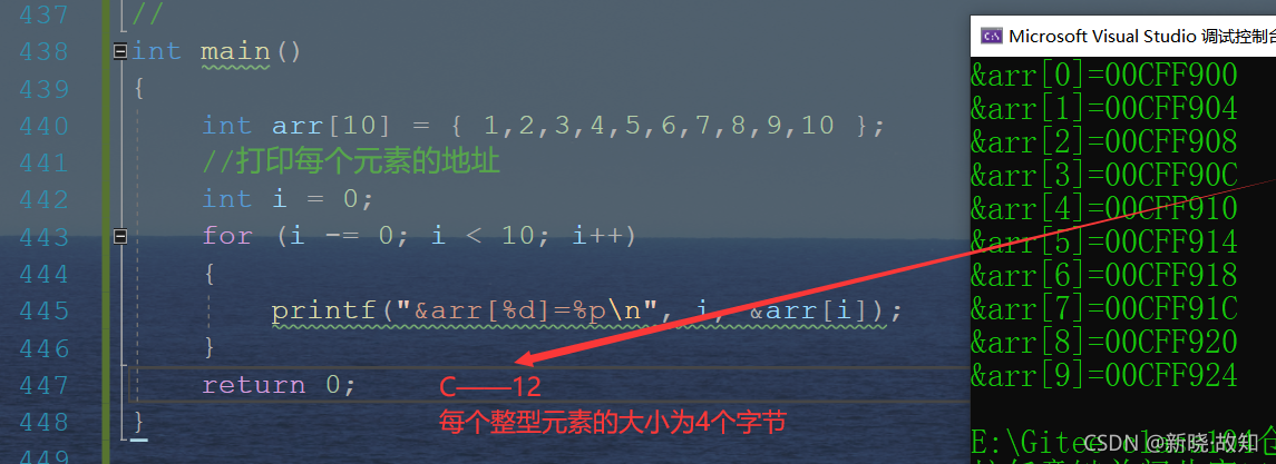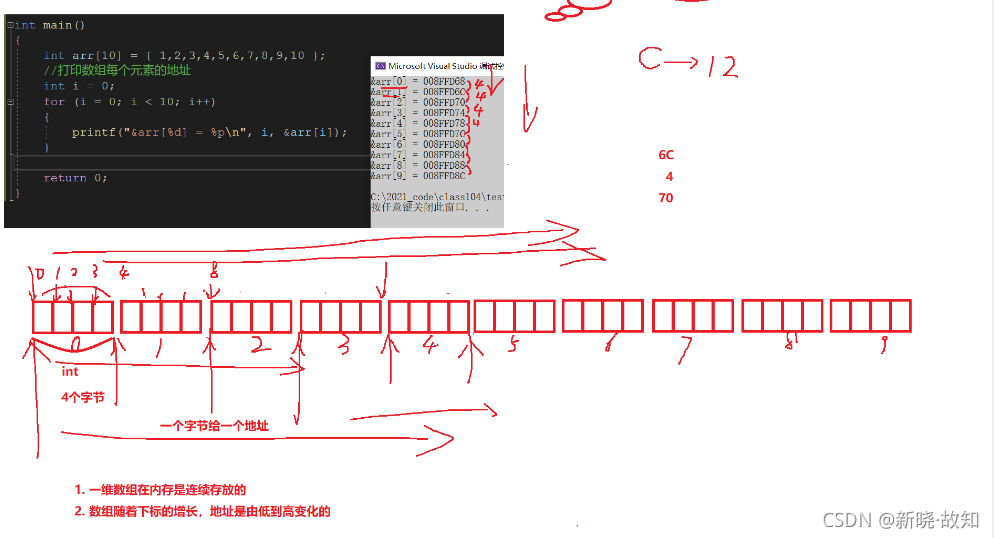 int main() { int arr[10] = { 1,2,3,4,5,6,7,8,9,10 }; //打印每个元素的地址 int i = 0; for (i -= 0; i < 10; i++) { printf("&arr[%d]=%p\n", i, &arr[i]); %p——打印地址 } return 0; }