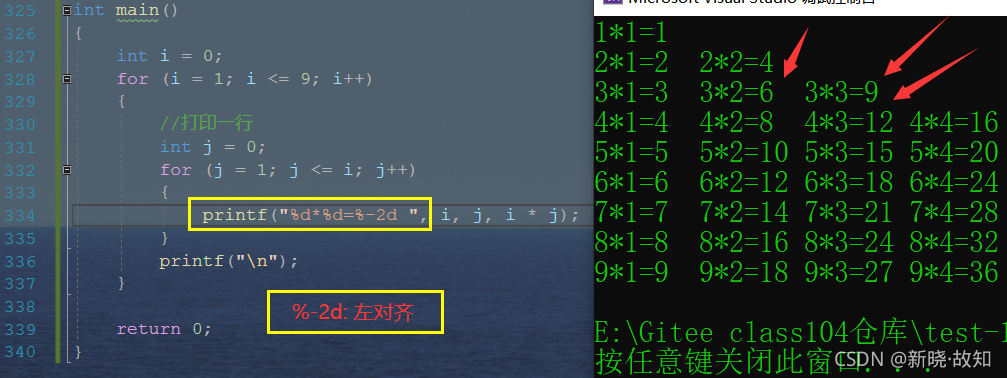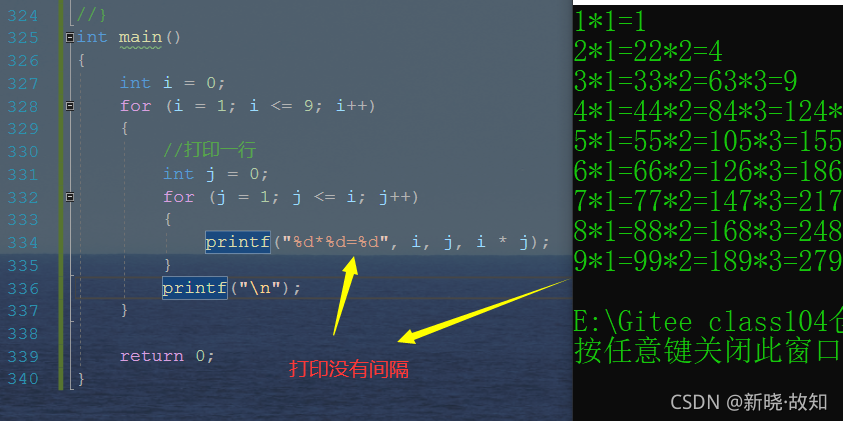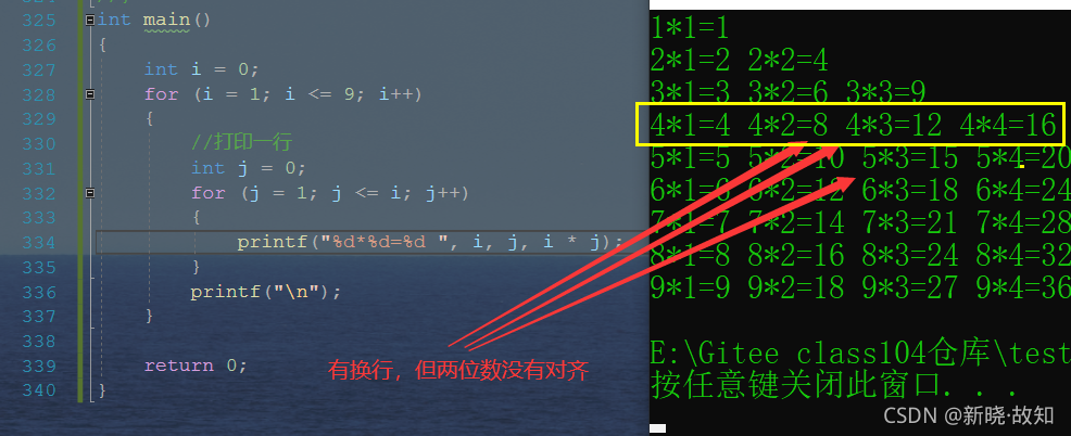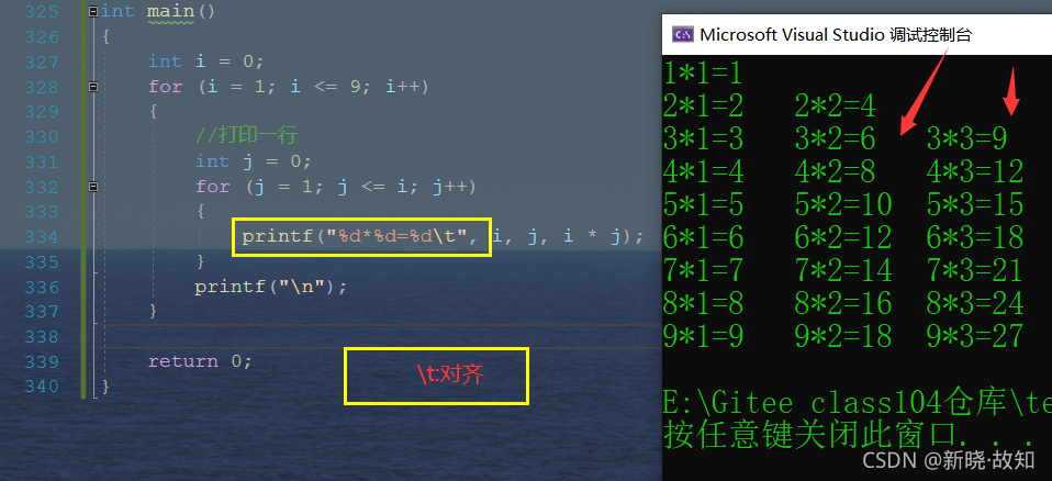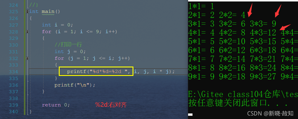 int main() { int i = 0; for (i = 1; i <=9; i++) { //打印一行 int j = 0; for (j = 1; j <= i; j++) { printf("%d*%d=%d\t", i, j, i * j); } printf("\n"); } return 0; }