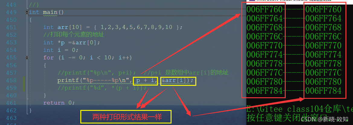 int main() { int arr[10] = { 1,2,3,4,5,6,7,8,9,10 }; //打印每个元素的地址 int *p =&arr[0]; int i = 0; for (i -= 0; i < 10; i++) { //printf("%p\n", p+i); //p+i 是数组中arr[i]的地址 printf("%p-----%p\n", p + i, &arr[i]); } return 0; }