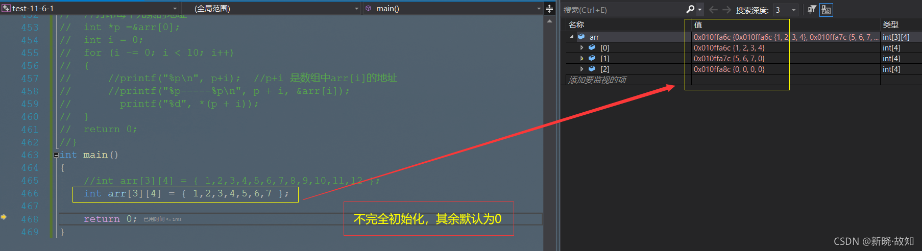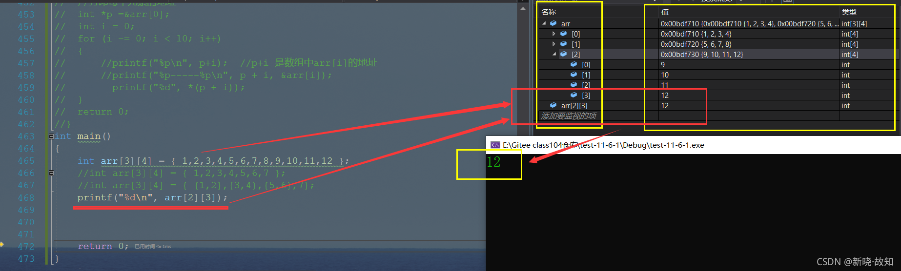 int main() { int arr[3][4] = { 1,2,3,4,5,6,7,8,9,10,11,12 }; //int arr[3][4] = { 1,2,3,4,5,6,7 }; //int arr[3][4] = { {1,2},{3,4},{5,6},7}; //printf("%d\n", arr[2][3]); int i = 0; for (i = 0; i < 3; i++) { int j = 0; for (j = 0; j < 4; j++) //列 { printf("%d ", arr[i][j]); } printf("\n"); } return 0; }