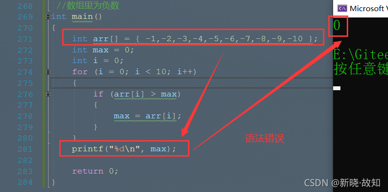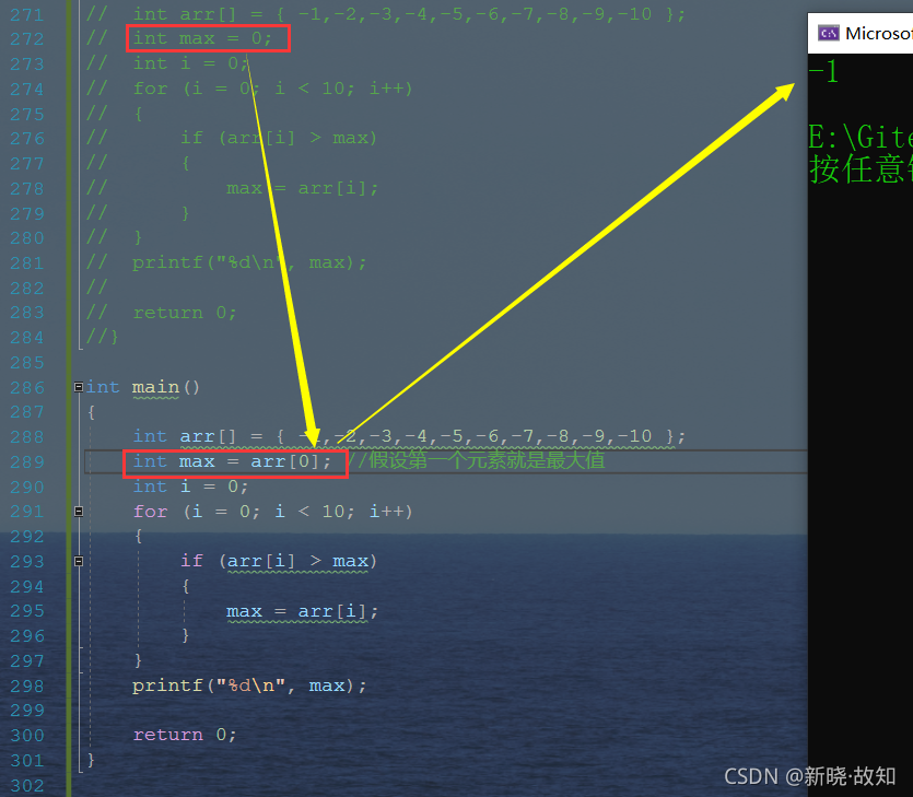 int main() { int arr[] = { -1,-2,-3,-4,-5,-6,-7,-8,-9,-10 }; int max = arr[0]; //假设第一个元素就是最大值 int i = 0; for (i = 0; i < 10; i++) { if (arr[i] > max) { max = arr[i]; } } printf("%d\n", max); return 0; }
