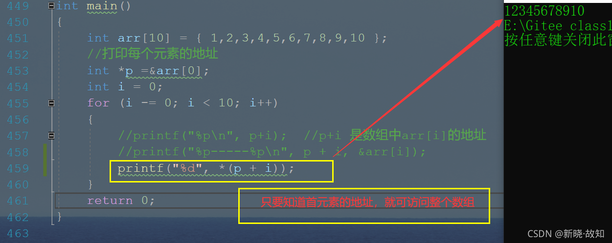 int main() { int arr[10] = { 1,2,3,4,5,6,7,8,9,10 }; //打印每个元素的地址 int *p =&arr[0]; int i = 0; for (i -= 0; i < 10; i++) { //printf("%p\n", p+i); //p+i 是数组中arr[i]的地址 //printf("%p-----%p\n", p + i, &arr[i]); printf("%d", *(p + i)); } return 0; }