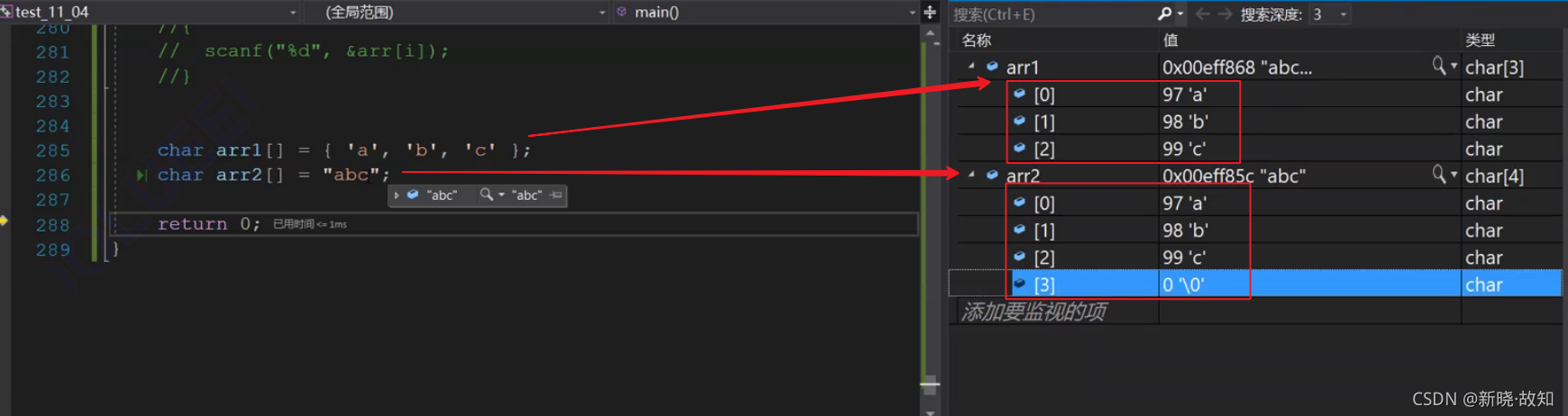 仔细观察输出的结果,我们知道,随着数组下标的增长,元素的地址,也在有规律的递增。 由此可以得出结论:数组在内存中是连续存放的。