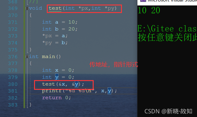 void test(int *px,int *py) { int a = 10; int b = 20; *px = a; *py = b; } int main() { int x = 0; int y = 0; test(&x, &y); printf("%d %d\n", x,y); return 0; }
