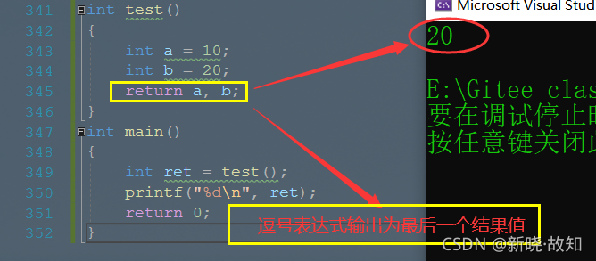 int test() { int a = 10; int b = 20; return a, b; } int main() { int ret = test(); printf("%d\n", ret); return 0; }
