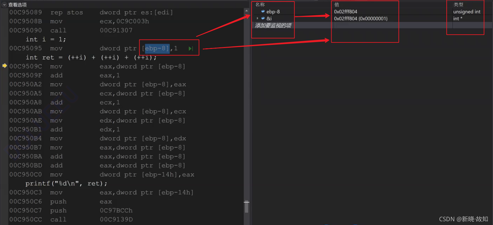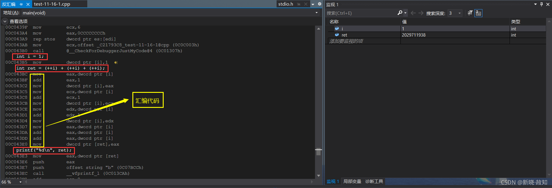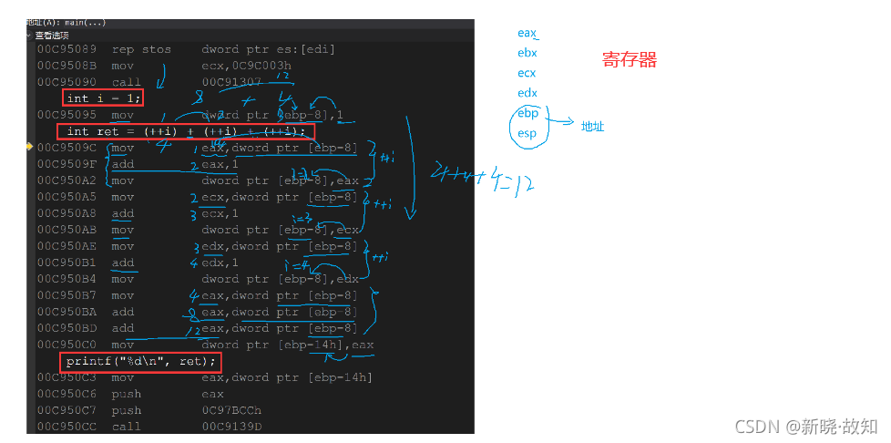 简单看一下汇编代码.就可以分析清楚. 这段代码中的第一个 + 在执行的时候,第三个++是否执行,这个是不确定的,因为依靠操作符的优先级 和结合性是无法决定第一个 + 和第 三个前置 ++ 的先后顺序。