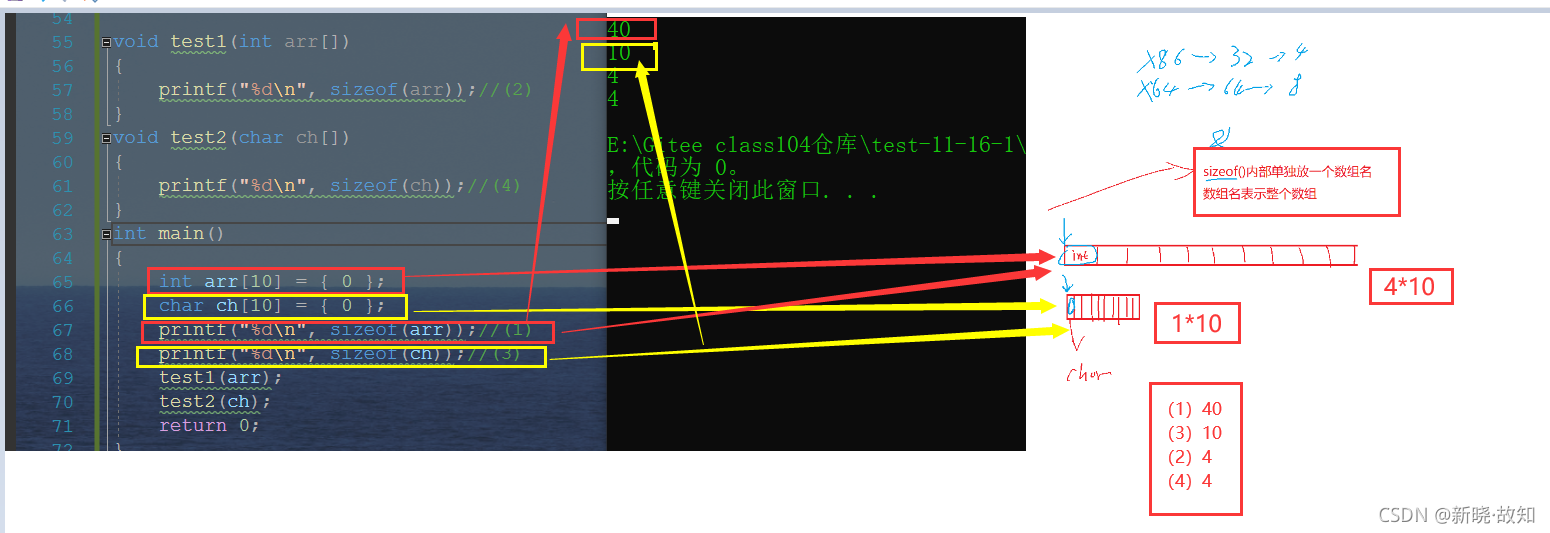 void test1(int arr[]) { printf("%d\n", sizeof(arr));//(2) } void test2(char ch[]) { printf("%d\n", sizeof(ch));//(4) } int main() { int arr[10] = { 0 }; char ch[10] = { 0 }; printf("%d\n", sizeof(arr));//(1) printf("%d\n", sizeof(ch));//(3) test1(arr); test2(ch); return 0; }