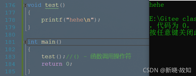 void test() { printf("hehe\n"); } int main() { test(); //() - 函数调用操作符 return 0; }