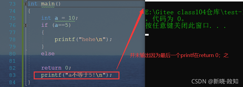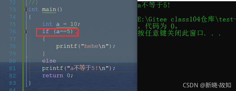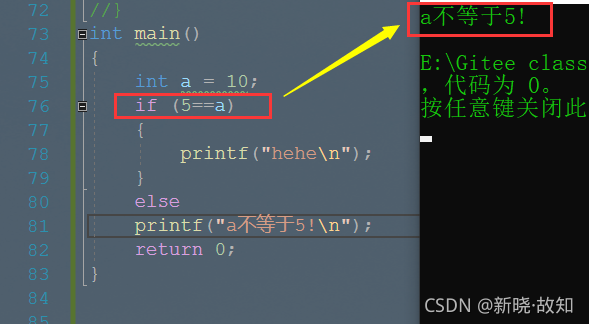 int main() { int a = 10; if (5==a) 建议的代码习惯 { printf("hehe\n"); } else printf("a不等于5!\n"); return 0; }