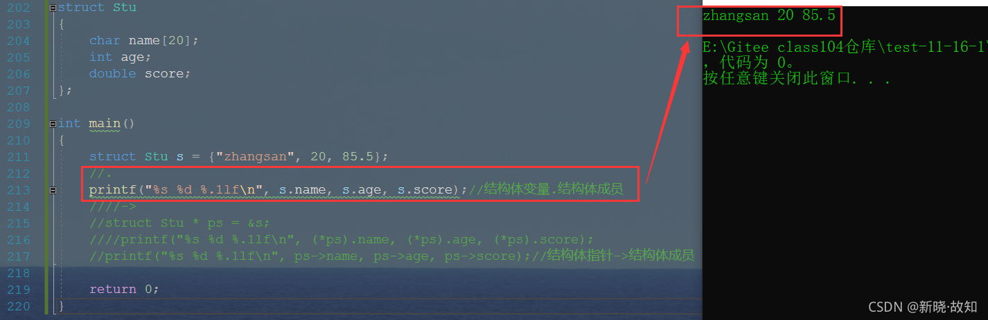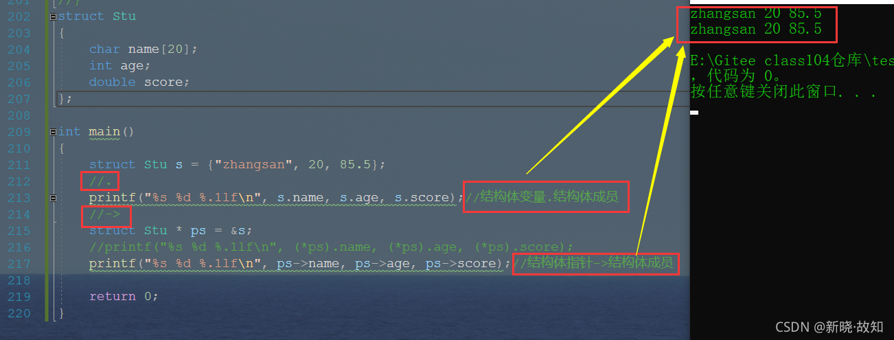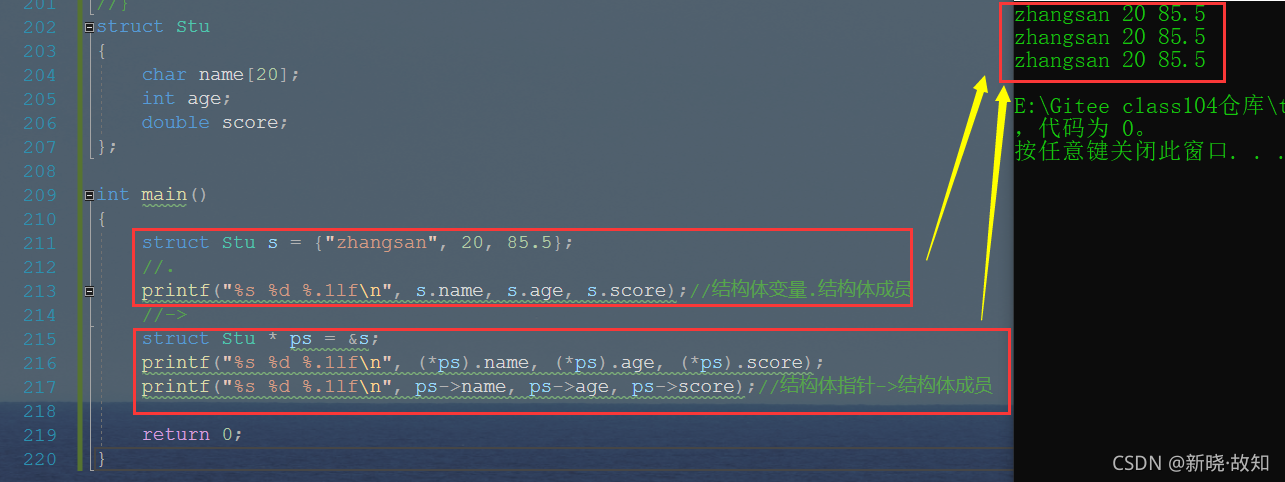 struct Stu { char name[20]; int age; double score; }; int main() { struct Stu s = {"zhangsan", 20, 85.5}; //. printf("%s %d %.1lf\n", s.name, s.age, s.score); 结构体变量.结构体成员 //-> struct Stu * ps = &s; printf("%s %d %.1lf\n", (*ps).name, (*ps).age, (*ps).score); printf("%s %d %.1lf\n", ps->name, ps->age, ps->score); 结构体指针->结构体成员 return 0; }