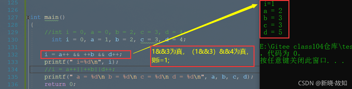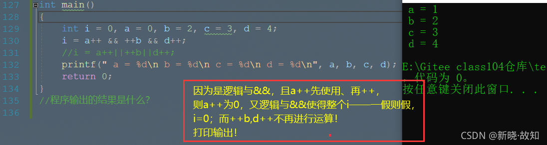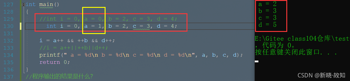 int main() { //int i = 0, a = 0, b = 2, c = 3, d = 4; int i = 0, a = 1, b = 2, c = 3, d = 4; i = a++ && ++b && d++; //i = a++||++b||d++; printf(" a = %d\n b = %d\n c = %d\n d = %d\n", a, b, c, d); return 0; } //程序输出的结果是什么?