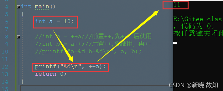 int main() { int a = 10; //int b = ++a;//前置++,先++,后使用 //int b = a++;//后置++,先使用,再++ //printf("a=%d b=%d\n", a, b); printf("%d\n", ++a); return 0; }