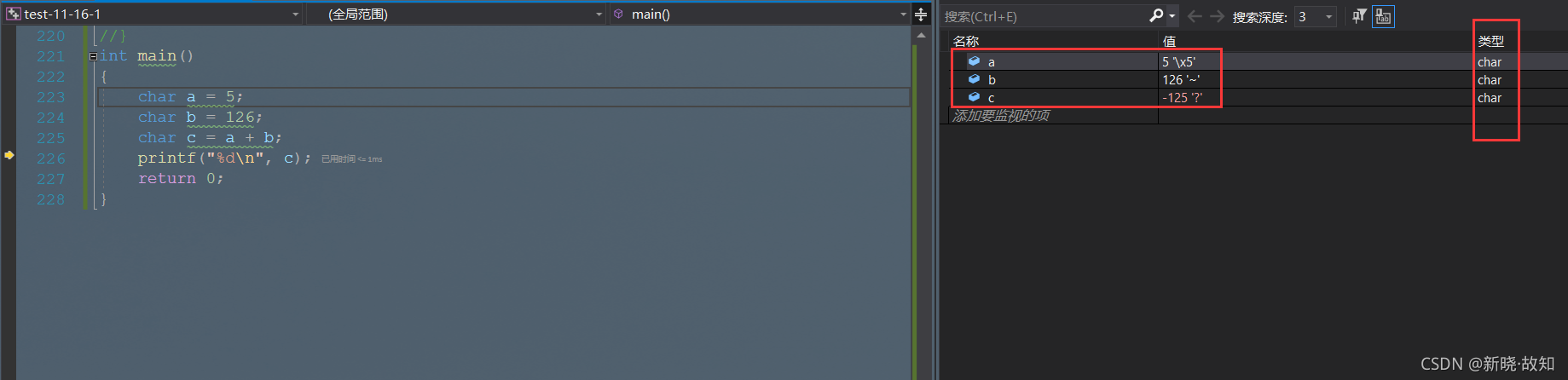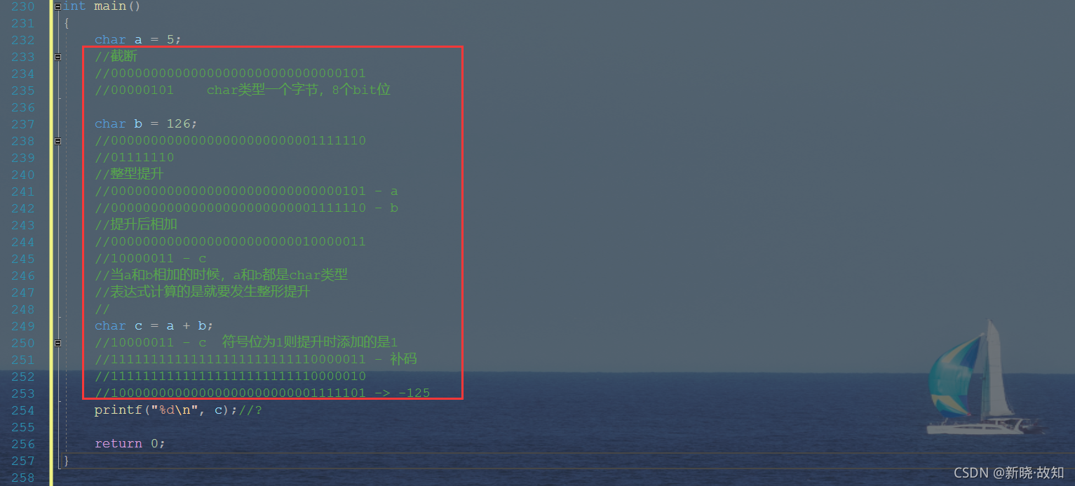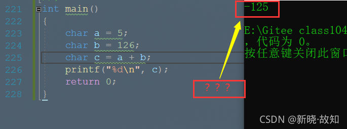 int main() { char a = 5; //截断 //00000000000000000000000000000101 //00000101 char类型一个字节,8个bit位 char b = 126; //00000000000000000000000001111110 //01111110 //整型提升 //00000000000000000000000000000101 - a //00000000000000000000000001111110 - b //提升后相加 //00000000000000000000000010000011 //10000011 - c //当a和b相加的时候,a和b都是char类型 //表达式计算的是就要发生整形提升 // char c = a + b; //10000011 - c 符号位为1则提升时添加的是1 //11111111111111111111111110000011 - 补码 //11111111111111111111111110000010 //10000000000000000000000001111101 -> -125 printf("%d\n", c);//? return 0; }