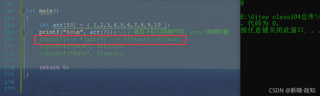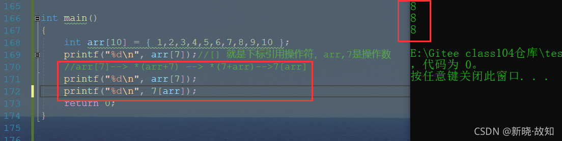 int main() { int arr[10] = { 1,2,3,4,5,6,7,8,9,10 }; printf("%d\n", arr[7]); 1.[] 就是下标引用操作符,arr,7是操作数 2.arr[7]--> *(arr+7) --> *(7+arr)-->7[arr] printf("%d\n", arr[7]); printf("%d\n", 7[arr]); return 0; }