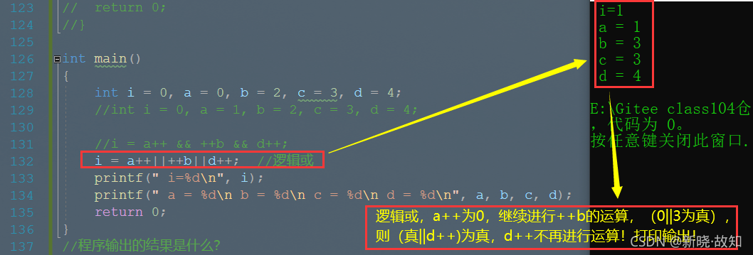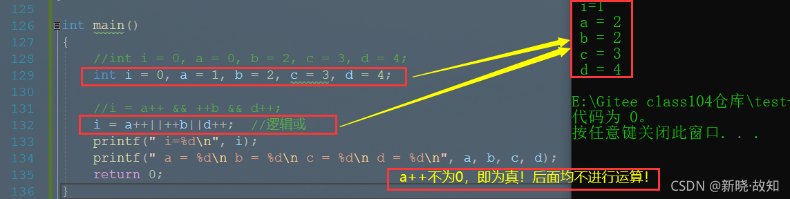 int main() { //int i = 0, a = 0, b = 2, c = 3, d = 4; int i = 0, a = 1, b = 2, c = 3, d = 4; //i = a++ && ++b && d++; i = a++||++b||d++; //逻辑或 printf(" i=%d\n", i); printf(" a = %d\n b = %d\n c = %d\n d = %d\n", a, b, c, d); return 0; }