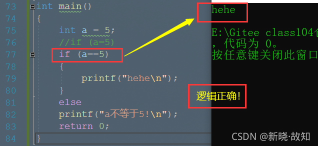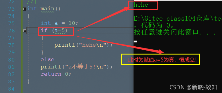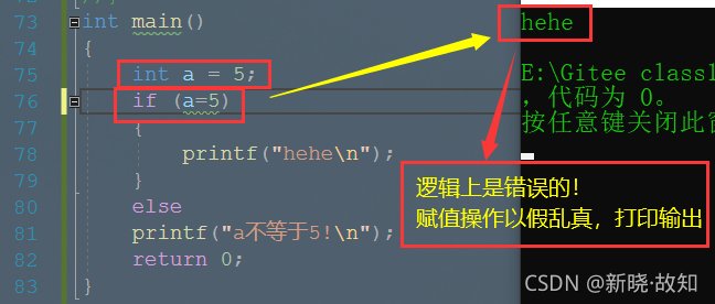 int main() { int a = 10; if (a=5) { printf("hehe\n"); } else printf("a不等于5!\n"); return 0; }