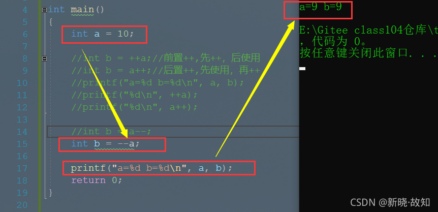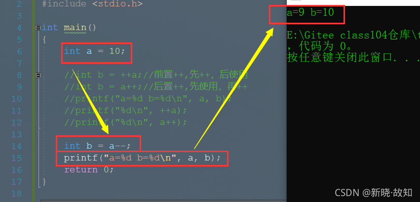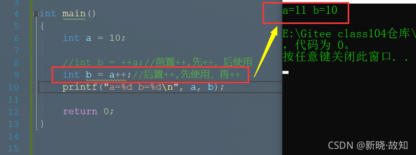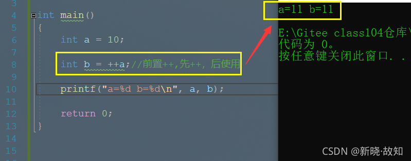 #include <stdio.h> int main() { int a = 10; int b = ++a; 前置++,先++,后使用 printf("a=%d b=%d\n", a, b); return 0; }