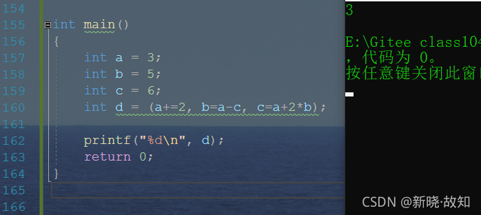 //代码3 a = get_val(); count_val(a); while (a > 0) { //业务处理 a = get_val(); count_val(a); } 如果使用逗号表达式,改写: while (a = get_val(), count_val(a), a>0) { //业务处理 }