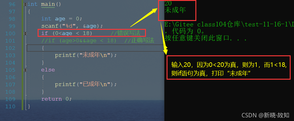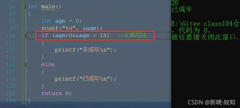 int main() { int age = 0; scanf("%d", &age); //if (0<age < 18) //错误写法 if (age>0&&age < 18) //正确写法 { printf("未成年\n"); } else { printf("已成年\n"); } return 0; }
