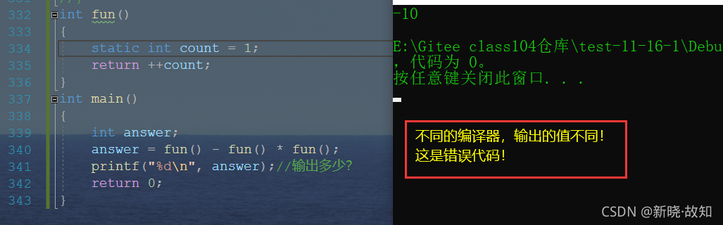 有问题! 虽然在大多数的编译器上求得结果都是相同的。 但是上述代码 answer = fun() - fun() * fun(); 中我们只能通过操作符的优先级得知:先算乘法, 再算减法。 函数的调用先后顺序无法通过操作符的优先级确定。