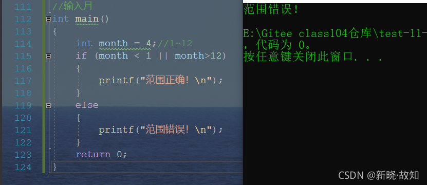 int main() { int month = 4;//1~12 if (month < 1 || month>12) { printf("范围正确!\n"); } else { printf("范围错误!\n"); } return 0; }