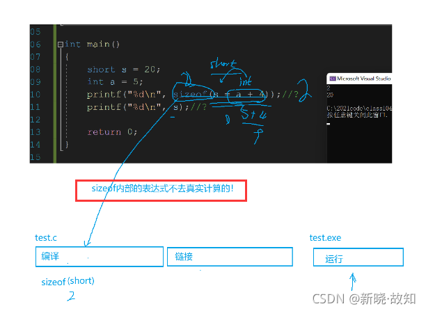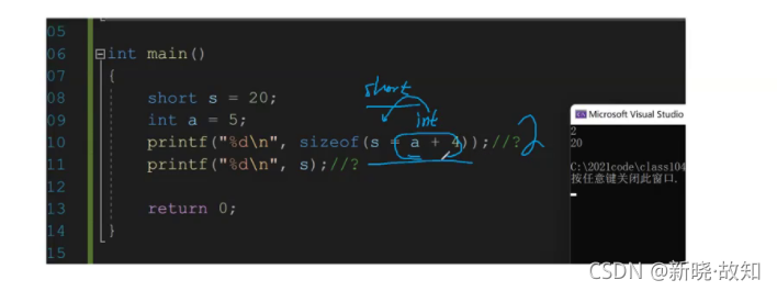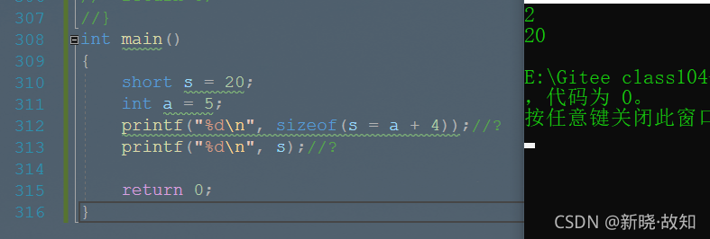 int main() { short s = 20; int a = 5; printf("%d\n", sizeof(s = a + 4));//? printf("%d\n", s);//? return 0; }