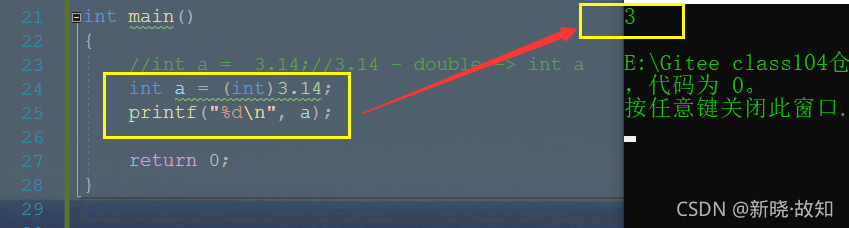 int main() { //int a = 3.14; 3.14 - double -> int a int a = (int)3.14; printf("%d\n", a); return 0; }