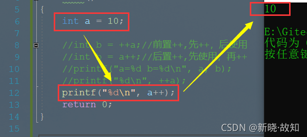 int main() { int a = 10; //int b = ++a;//前置++,先++,后使用 //int b = a++;//后置++,先使用,再++ //printf("a=%d b=%d\n", a, b); //printf("%d\n", ++a); printf("%d\n", a++); return 0; }