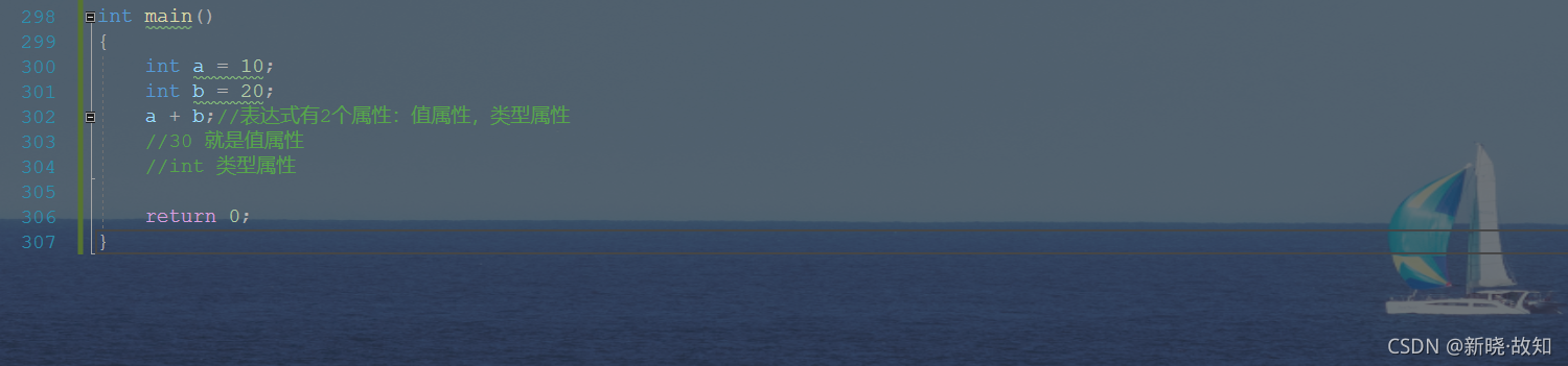 int main() { int a = 10; int b = 20; a + b; 表达式有2个属性:值属性,类型属性 30 就是值属性 int 类型属性 return 0; }