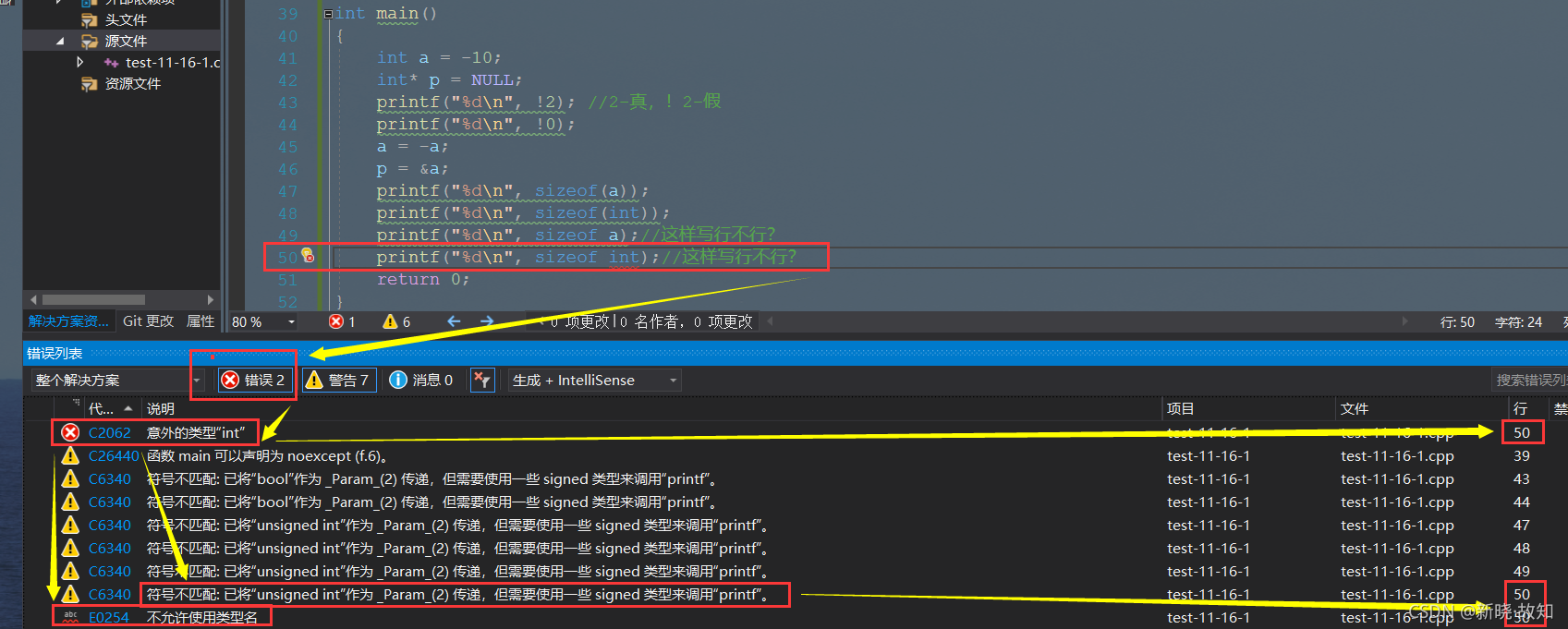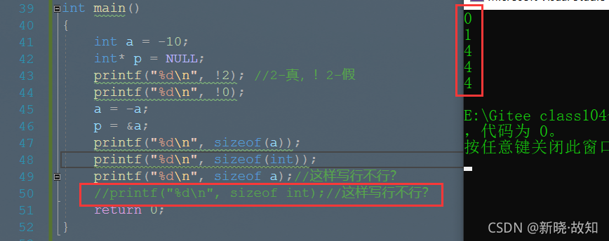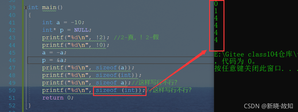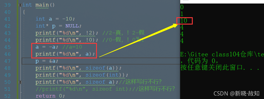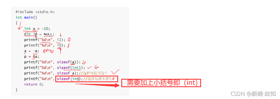 #include <stdio.h> int main() { int a = -10; int *p = NULL; printf("%d\n", !2); printf("%d\n", !0); a = -a; p = &a; printf("%d\n", sizeof(a)); printf("%d\n", sizeof(int)); printf("%d\n", sizeof a);//这样写行不行? printf("%d\n", sizeof int);//这样写行不行? return 0; }