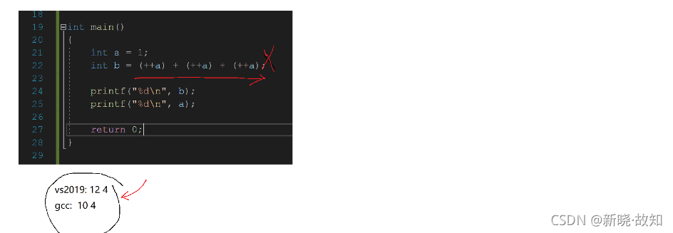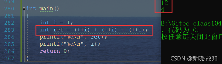 代码5 #include <stdio.h> int main() { int i = 1; int ret = (++i) + (++i) + (++i); printf("%d\n", ret); printf("%d\n", i); return 0; }