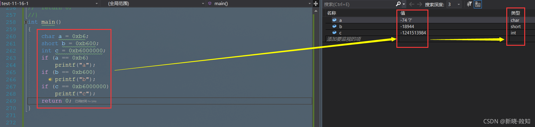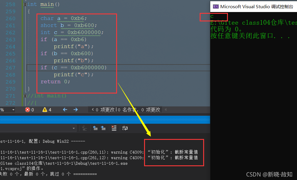 实例1 int main() { char a = 0xb6; short b = 0xb600; int c = 0xb6000000; if(a==0xb6) printf("a"); if(b==0xb600) printf("b"); if(c==0xb6000000) printf("c"); return 0; }
