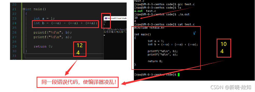 注释:同上,操作符的优先级只能决定自减--的运算在+的运算的前面,但是我们并没有办法得 知,+操作符的左操作数的获取在右操作数之前还是之后求值,所以结果是不可预测的,是有歧义 的。